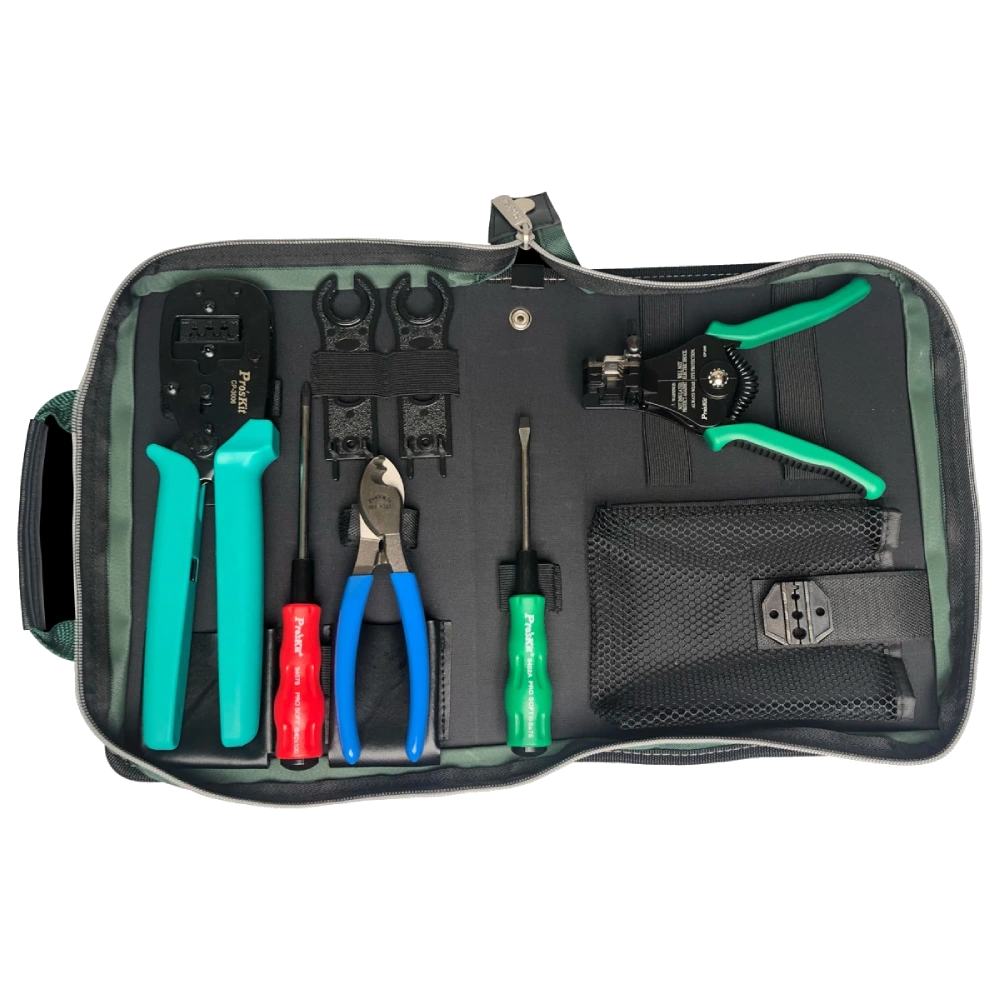 Інструменти в сумці Pro'sKit PK-2061 для Solar-конекторів. Набір містить все необхідне для якісної та безпечної установки/обслуговування сонячних електростанцій: 2 гайкові ключі (з відкритим кінцем MC4 та MC4 PLUS, розблокувальним інструментом для відкриття запірного пристрою, затискання та затягування кабельних вводів), стрипер для зачистки ізоляції сонячного кабелю. кримпер для обтиску плоских неізольованих роз'ємів (автоклем), дві змінні матриці, різак та дві викрутки з оксидним наконечником.