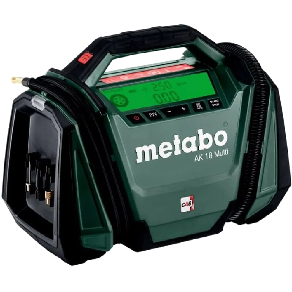 Безмасляний компресор; Макс. тиск 11 bar; Продуктивність 16 л/хв; Довжина шланга високого тиску 1200 мм; Довжина шланга для об'ємного накачування 490 мм; Акумулятор 18 В, Li-Ion; Габарити 328 х 185 х 256 мм;