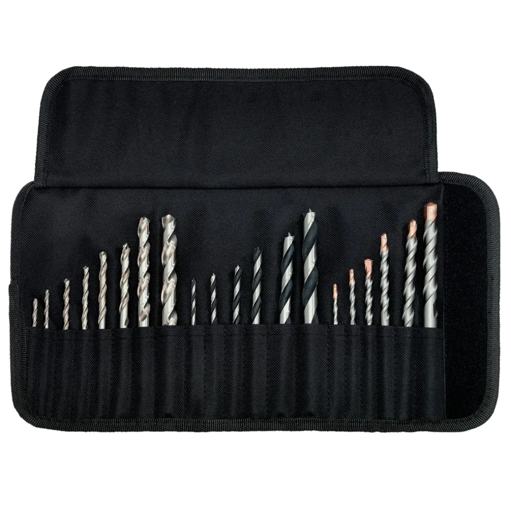 Свердло по металу з високосортної швидкорізальної сталі згідно DIN 338, після роликової прокатки, циліндричне, праворізне, тип N, підходить для свердління сталі, кольорових металів, легованого та нелегованого сталевого лиття. Опір розриву до 900 Н/мм. Свердло по каменю для звичайних та ударних дрилів; фрезероване виконання, твердосплавна пластина 130, для свердління цегли, цегляної кладки, натурального каменю. Свердло по дереву з високоякісної сталі, загартоване, з центрувальним вістрям. Для свердління твердих та м'яких порід деревини, фанери, ДСП. 20 предметів у складній сумці. Свердла по металу (HSS-G) 2 x Ø 3 x 62 /2 x Ø 4 x 62 / 1 x Ø 5 x 75 / 1 x Ø 6 x 92 / 1 x Ø 8 x 117/1 x Ø 10 x 135 мм; свердла по дереву 1 x Ø 3 x 62/4 x 74/5 x 85/6 x 92/8 x 117/10 x 133 мм; свердла по каменю 1 x & Oslash; 3 x 60/4 x 75/5 x 85/6 x 100/8 x 120/10 x 120 мм.