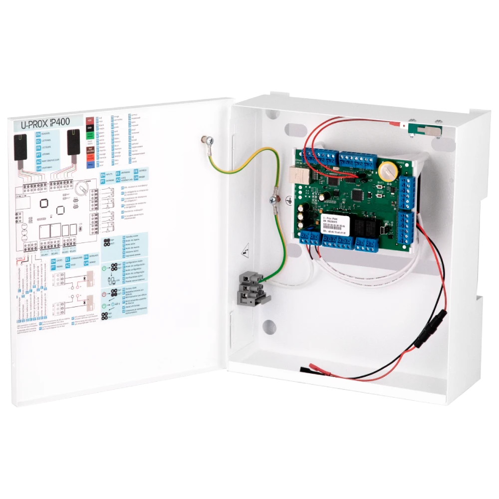 Вісім входів для підключення шлейфів, два реле (контакти NO, NC, COM) 5 А @ 24 В, два реле (контакти NO, COM) 1 А @ 24 В; Підключення Ethernet 10BASE-T/100BASE-TX; Підтримка Wiegand 26, 37,83 47000 подій, тайм-зон 250, тижневих розкладів 25, свят 250; Годинник реального часу, функція Антидубль; 12V